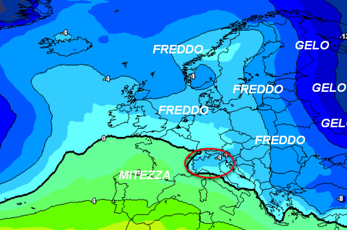 Freddo, anzi gelo, sulla parte estrema orientale del Continente e sulla vicina Russia. Il freddo, come si evince anche dalla mappa, interesserà anche le regioni settentrionali, parte del centro ed il settore adriatico con isoterme alla medesima quota comprese tra 0 e -2 (-4° solo sulle Alpi).