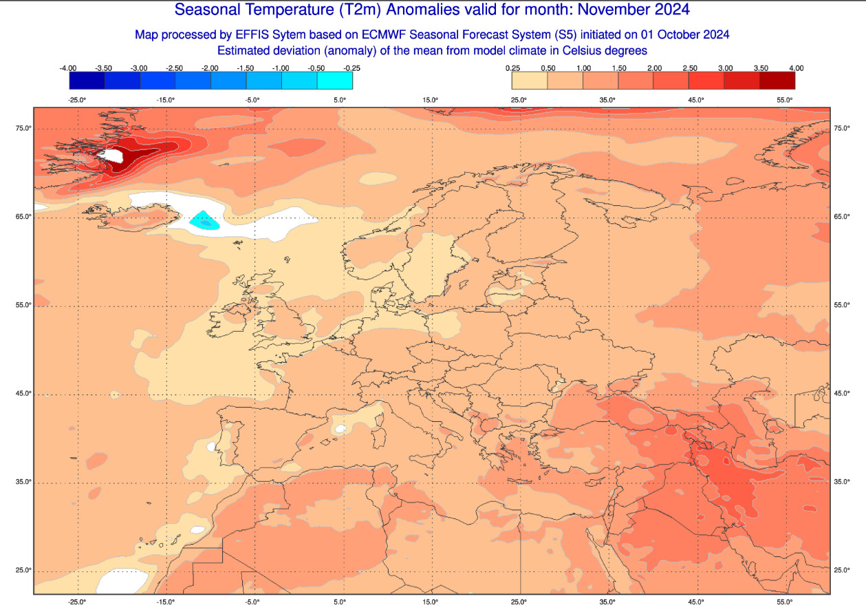QUADRO TERMICO: la prima mappa mostra le anomalie di temperatura attese in Europa in tutto il mese di novembre: