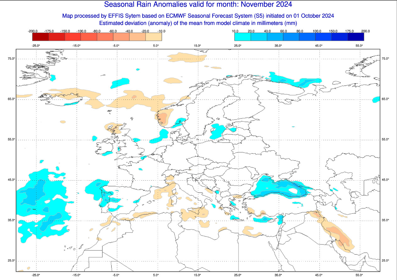 QUADRO PRECIPITATIVO: la seconda cartina mostra le anomalie precipitative attese in Europa nell’arco di tutto il mese di novembre: