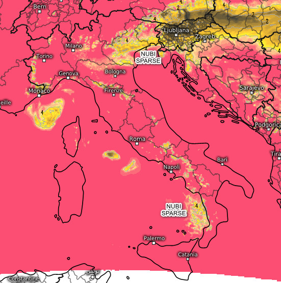 Passiamo adesso alla giornata di lunedi 9 giugno: questo è il soleggiamento totale cumulato previsto tra le 9 e le 16 della giornata medesima (rosa molto soleggiato, giallo nubi e schiarite, grigio scuro assenza di sole):