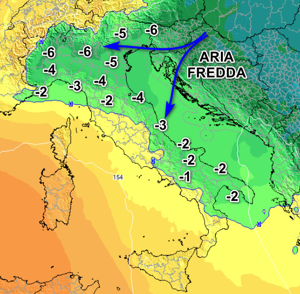 Al nord valori a 1500 metri compresi tra -4 e -6°; tra 0 e -3° nelle aree interne del centro e il versante adriatico, tra 0 e -2° sul meridione peninsulare. Resteranno escluse da questo abbraccio freddo le regioni centrali tirreniche, le Isole e la punta estrema della Calabria. Pochi i fenomeni da segnalare a parte qualche locale precipitazione breve e transitoria.