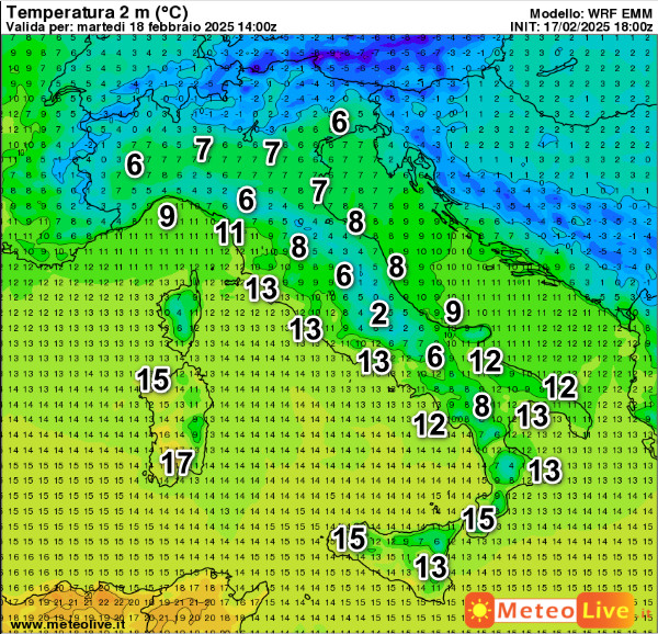 Sul fronte delle temperature, questi sono i valori attesi al suolo in Italia alle ore 15 di martedi 18 febbraio:
