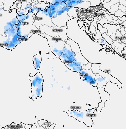 Ecco infine una mappa che chiarisce come potrebbero distribuirsi le precipitazioni: