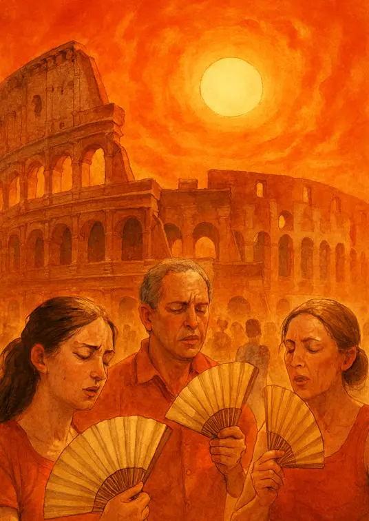 Si sventolano i pensionati sulle panchine, si rintanano i bambini sotto i gazebo delle piscine, si cerca ristoro nelle fontanelle, gelaterie, e nei sogni di una brezza che non arriva mai. Le città si trasformano in arene infuocate, dove ogni spostamento è una sfida, ogni notte un’attesa dell’alba più fresca che non si verifica.