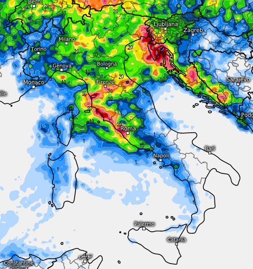 Anche il Centro Italia non sarà risparmiato dall’ondata di maltempo. L’instabilità si farà sentire in modo significativo tra il tardo pomeriggio del 20 e la giornata del 21 agosto, con le città di Firenze e a seguire Roma tra le più esposte. Rimarrebbero invece sottovento e dunque in ombra pluviometrica (poche o nulle le piogge) Marche ed Abruzzo, raggiunta invece dai temporali toscani la Romagna.