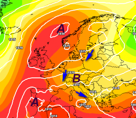 Eppure c’è anche la linea di tendenza che prova comunque a far entrare l’anticiclone in modo franco almeno sino alla Valpadana, con qualche concessione solo sulle Alpi e l’estremo nord-est come vediamo qui: