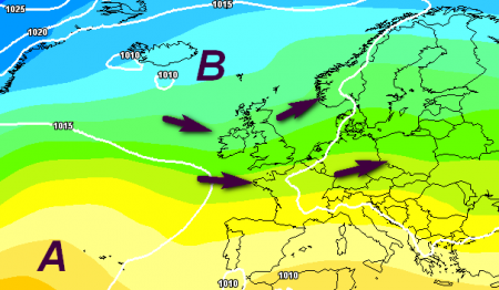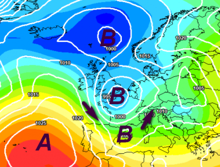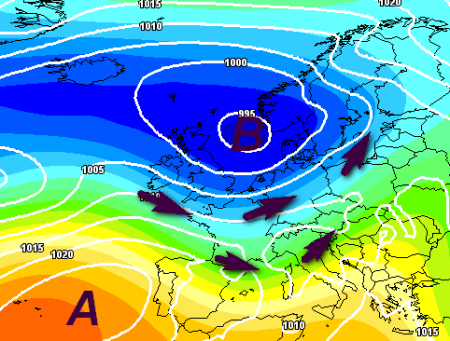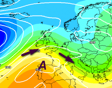 Vediamo la carta barica che evidenzia il passaggio di questa saccatura sul centro Europa, che finirà per infilarsi sul Mediterraneo centrale: