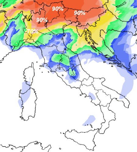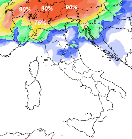 Andiamo in sequenza, la prima mappa è riferita alla mattinata di giovedì 13 e la colorazione tendente al rosso segnala percentuali confortanti su Alpi ed alte pianure: