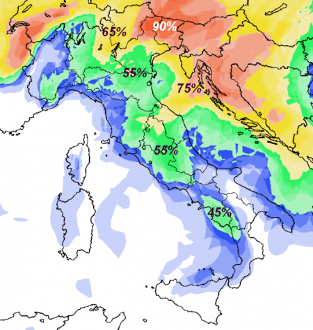 La terza invece riguarda la giornata di venerdì 14 e mette in evidenza una percentuale più bassa ma comunque sufficientemente rilevante su molte regioni, specie quelle nord-orientali e quelle interne centrali: