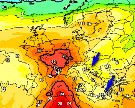 Un tentativo di penetrazione delle correnti Atlantiche da ovest potrebbe intervenire intorno a lunedì 11 o martedì 12 settembre ma limitato alle regioni settentrionali ma con attendibilità al momento non superiore al 30% e che coinvolgerebbe principalmente le zone alpine ed eventualmente le alte pianure, ecco comunque una mappa prevista proprio per quelle date: