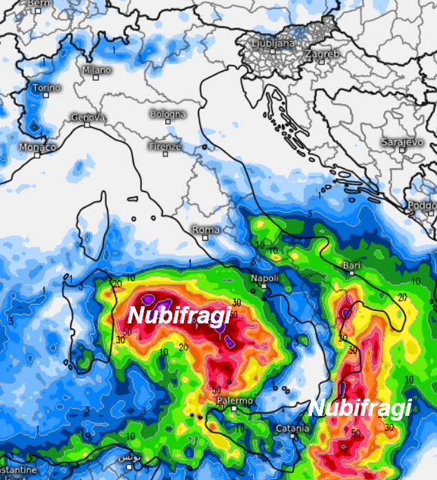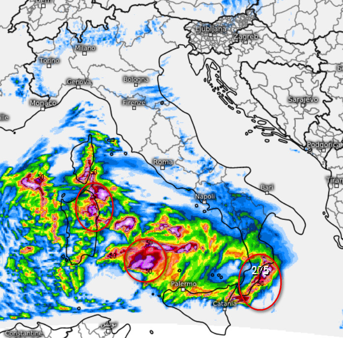 Rovesci intensi con rischio di nubifragi saranno possibili sulla Sardegna orientale. Temporali intensi agiranno nel braccio di mare compreso tra la Sicilia e la Sardegna. Piogge molto intense interverranno anche sulla Calabria Ionica e sul nord della Sicilia. Sul resto d’Italia piogge praticamente assenti a parte sporadici piovaschi tra la Campania e la Lucania. Temperature in calo stante il concorso di venti orientali.