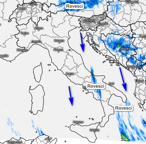 Ancora rischio di rovesci soprattutto tra il Molise e la Lucania. Fenomeni comunque locali ed alternati a schiarite. Ultimi piovaschi anche sui versanti esteri dell’Alto Adige, ma in via di attenuazione, per il resto tempo splendido. Ancora venti forti da nord sul medio-basso Adriatico ed al sud, venti deboli altrove.