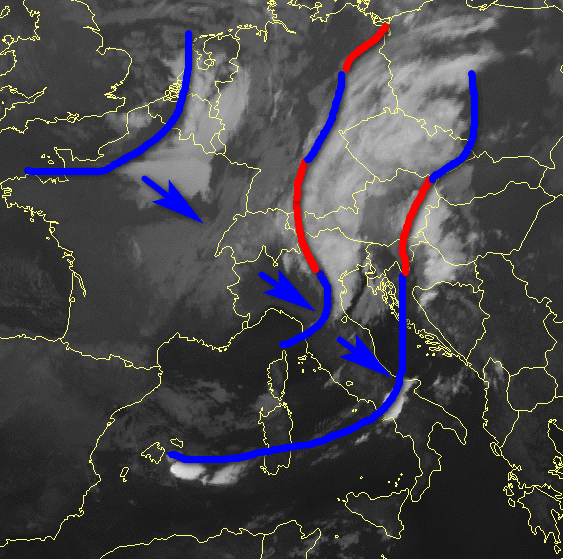 L’attacco delle fresche correnti da nord-ovest è stato forse superiore alle attese. Notate come l’Italia venga attraversata da impulsi perturbati in successione, l’ultimo della serie (al momento sul nord della Francia) interesserà il nord-est e il versante adriatico tra la prossima notte e la prima mattinata di mercoledì 9 luglio.