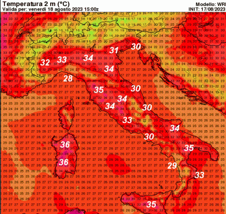 Punte di 36° in Sardegna, 35° in Sicilia, sulla bassa Lucania e le aree interne della Toscana.