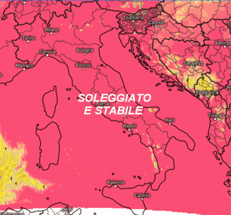 Tempo stabile e soleggiato ovunque con eventuali addensamenti che avranno carattere temporaneo e non saranno associati a nessuna precipitazione. Temperature in aumento.