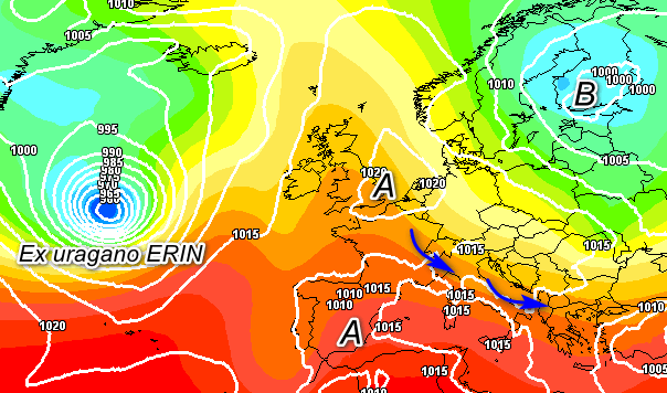Sulla sinistra dell’immagine notiamo un ex ciclone tropicale denominato ERIN che si avvicina minaccioso alle coste occidentali europee. E’ ormai spompato, ma determinerà effetti su molte nazioni nei prossimi giorni, compresa anche l’Italia.