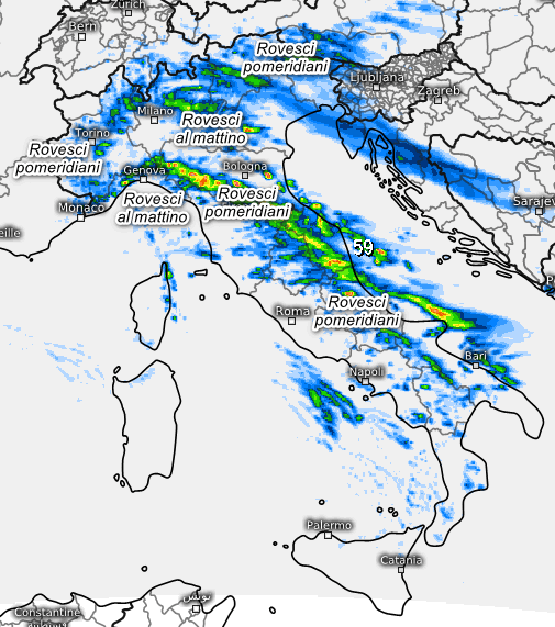 Passiamo ai temporali previsti nella giornata di domenica 24 agosto in Italia: