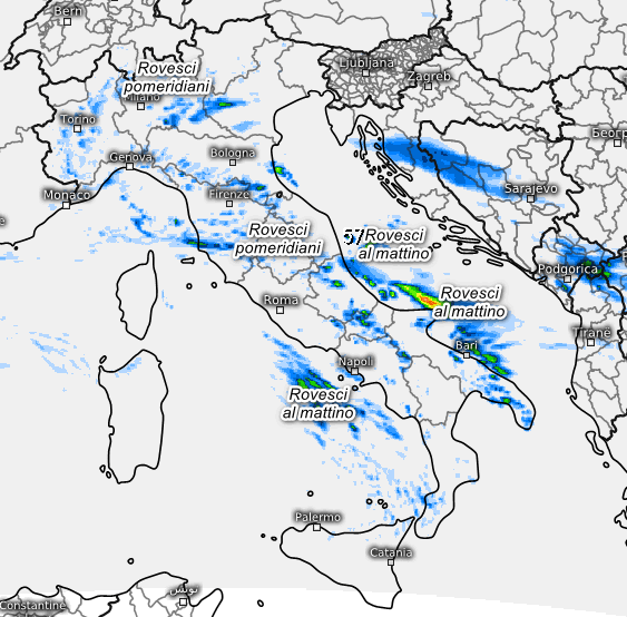 Instabilità in attenuazione sull’Italia. Tuttavia, tra la notte e il mattino saranno ancora possibili rovesci al largo sul basso Tirreno e lungo le coste di Abruzzo e Puglia Garganica, ma in via di attenuazione. Nel pomeriggio qualche acquazzone nelle aree interne appenniniche e sul settore alpino e prealpino centrale ed orientale, altrove assenza di fenomeni. Generale attenuazione della nuvolosità e dei fenomeni annessi dopo il tramonto. Temperature in aumento, ma niente caldo intenso.