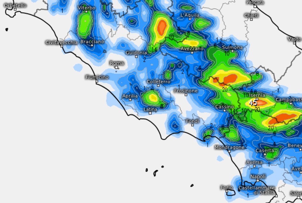 Ecco la mappa dei temporali previsti nel pomeriggio di Ferragosto con zoom su Lazio e Campania: