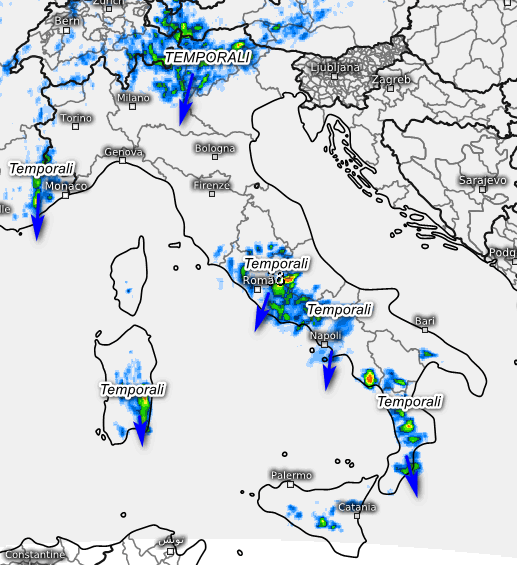 Al mattino cielo in prevalenza sereno o con qualche isolato temporale segnatamente in mare aperto. Nel pomeriggio brevi temporali su arco alpino centro-orientale, Alpi occidentali, Sardegna interna, Appennino centro-meridionale con possibili sconfinamenti più o meno attenuati lungo le coste tirreniche, specie su bassa Toscana, Lazio (possibile coinvolgimento anche di Roma al 25%) e Campania.