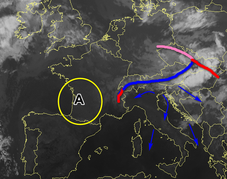 L’alta pressione si mantiene forte tra l’Europa sud-occidentale e il Bacino occidentale del Mediterraneo. Sull’Italia, la figura stabilizzante si è fatta in parte sorprendere dalla coda di una perturbazione in scivolamento verso la Penisola Balcanica. Vediamo tutto tramite l’ultima immagine satellitare di giovedi 17 alle ore 8:
