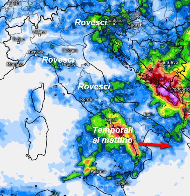 Tra la Campania, la Calabria Tirrenica e il nord della Sicilia avremo gli ultimi temporali tra la notte e la mattinata legati alla perturbazione ormai evoluta verso levante. I fenomeni potrebbero essere anche intensi tra il Cilento e il nord della Calabria, prima di attenuarsi nel pomeriggio. Sul resto d’Italia subentreranno condizioni di variabilità con rischio di qualche rovescio sul Friuli, l’Appennino Tosco-Emiliano e tra Umbria e Marche. Sul resto d’Italia non dovrebbero esserci fenomeni degni di nota.