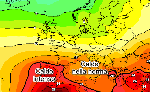 Infine, uno sguardo alle temperature attese a 1500 metri per la giornata di martedì 5 agosto in Europa e sul Mediterraneo.