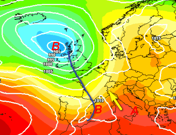 Ecco la suddetta perturbazione che verrà ospitata in una saccatura atlantica abbastanza vasta. Una depressione in formazione sul Mediterraneo occidentale imporrà una rotazione delle correnti a Scirocco nei bassi strati. Tali correnti andranno a penalizzare soprattutto il settore di nord-ovest nel pomeriggio-sera di lunedi con temporali anche intensi. Il resto d’Italia resterà in attesa ed al sud si avrà anche un aumento delle temperature massime.