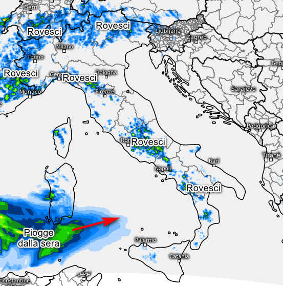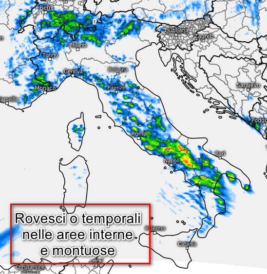 I rovesci che stanno interessando al momento le pianure e le coste adriatiche cesseranno nell’arco della mattinata di martedì. Nel pomeriggio e nella prima parte della sera la situazione prevista sarà quella descritta dalla mappa, ovvero con rovesci e temporali lungo tutte le aree interne e montuose della Penisola, specie su alto Piemonte e alta Lombardia e anche su Lazio e Campania.