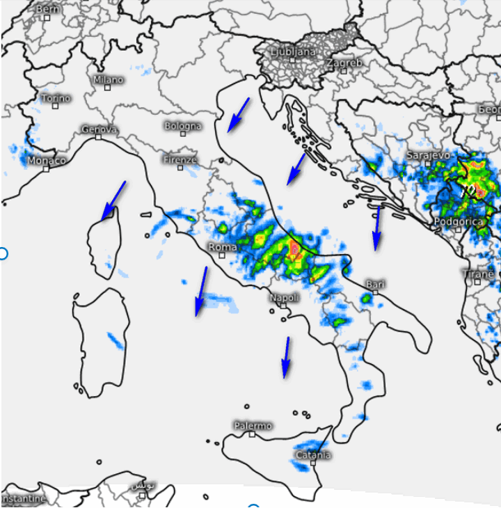 Temporali su Abruzzo, Molise, zone interne del Lazio (con forse un interessamento della città di Roma). Rovesci e qualche temporale anche tra la Puglia e la Lucania; più sporadici i fenomeni sul restante meridione e la Sicilia.
