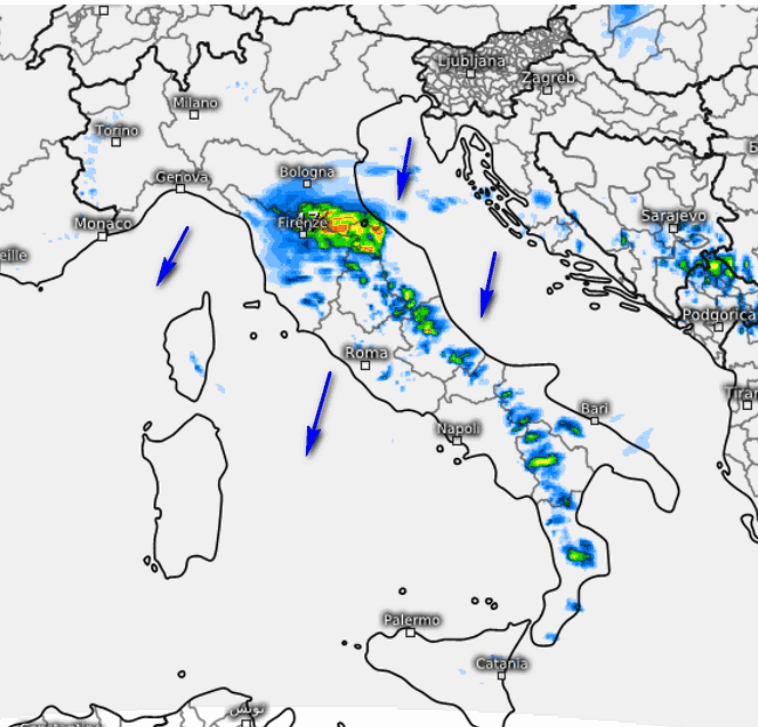 Al mattino rovesci e qualche temporale tra le coste della Romagna e le Marche. Dopo il mezzogiorno concentrazione dei fenomeni nelle aree interne, segnatamente tra entroterra toscano, Umbria, zone interne di Marche e Abruzzo. Rischio di rovesci anche nelle aree interne di Lucania e Calabria, per il resto assenza di fenomeni.