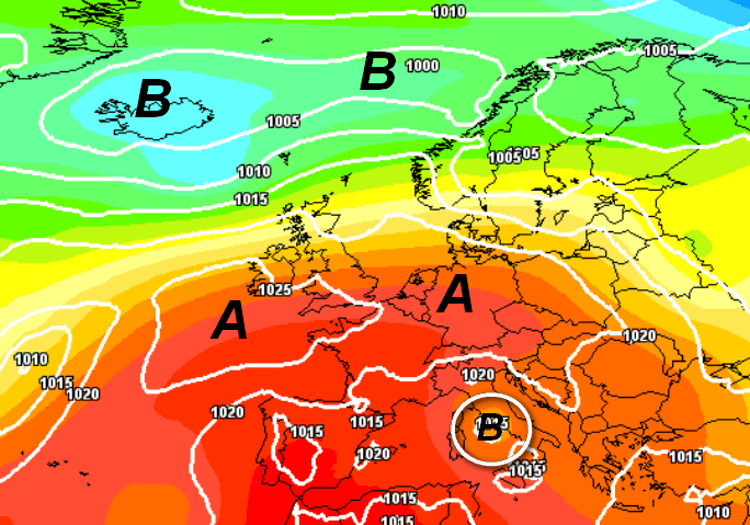 Ecco la goccia fredda in quota che sarà posizionata grossomodo sul Lazio. L’alta pressione africana sposterà il proprio baricentro ad ovest, mentre l’alta pressione delle Azzorre invaderà l’Europa centro-occidentale.
