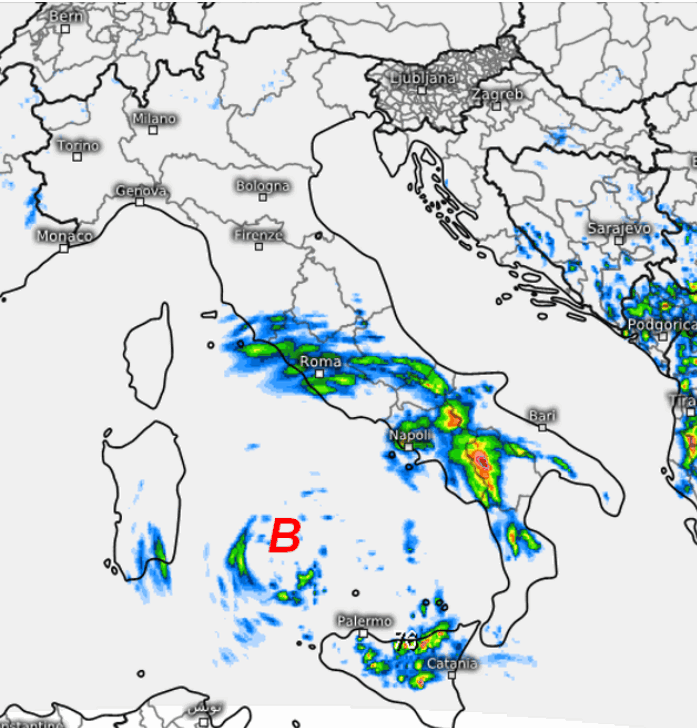 La goccia fredda si posizionerà poco a nord della Sicilia. Avremo temporali nel braccio di mare compreso tra le due Isole Maggiori. Temporali anche sulla Sardegna meridionale, la Sicilia orientale, la Calabria Tirrenica, la Campania, parte della Lucania e sul Lazio. Sul resto d’Italia fenomeni assenti o poco probabili.