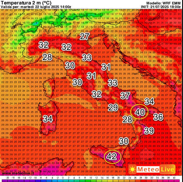 Sul fronte delle temperature, sarà un’altra giornata difficile per le estreme regioni meridionali. Questi sono i valori termici attesi in Italia alle ore 16 di martedi 21 luglio: