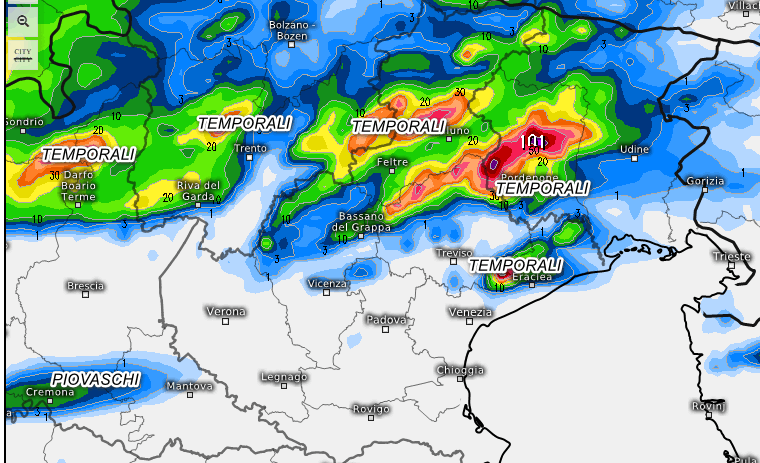 Temporali anche forti tra il pomeriggio e la serata sull‘Alto Veneto, ma soprattutto tra il Trentino e il Friuli dove avremo anche nubifragi. Scarsi i fenomeni sulle restanti aree a parte piovaschi, probabilmente a base alta, in arrivo su Cremonese e Mantovano in serata.