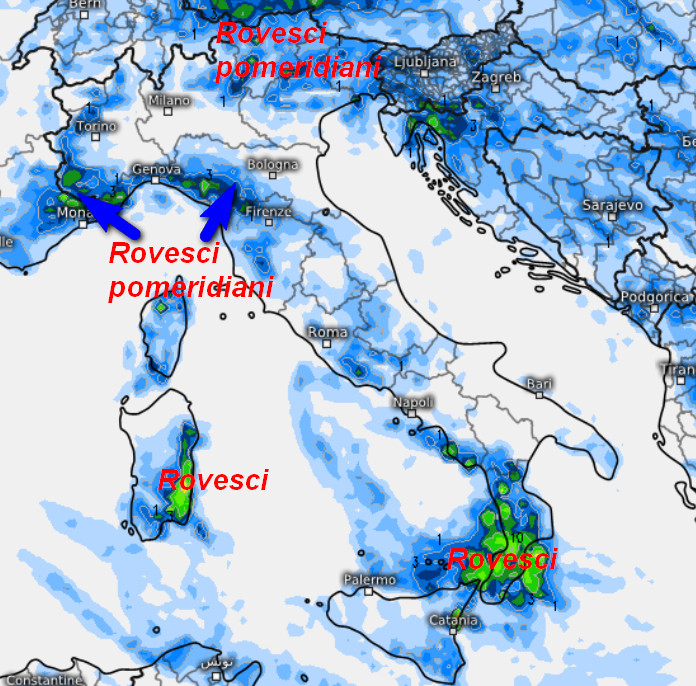 Al mattino avremo ancora qualche rovescio tra la Sicilia settentrionale e la bassa Calabria che si trasferirà nelle rispettive zone interne nel pomeriggio. Rovesci pomeridiani sulla Sardegna orientale oltre alle Alpi Marittime, l’Appennino Ligure e i settori alpini centrali ed orientali; basso il rischio di sconfinamenti in Valpadana. Fenomeni quasi ovunque in cessazione dopo il tramonto.