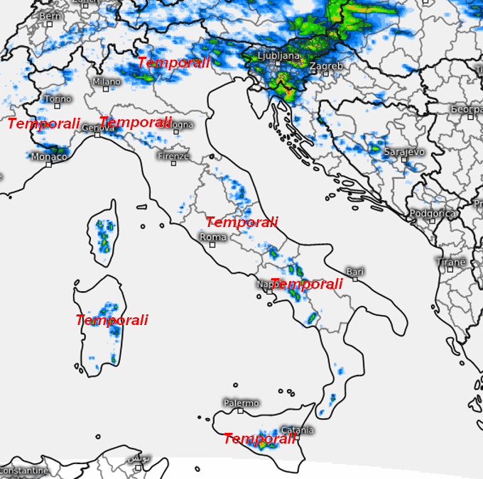 Al mattino, a parte qualche rovescio sui settori di confine delle Alpi centro-orientali, non si avranno fenomeni. Nel pomeriggio avremo lo sviluppo di temporali essenzialmente sui rilievi di alta Lombardia, alto Veneto, Friuli, Alpi occidentali, Appennino Ligure-Piacentino. Temporali anche nelle aree interne delle Marche, zone interne della Sardegna, entroterra campano e siciliano. Basso il rischio di sconfinamenti in pianura ed ancor più basso lungo le coste. Questi temporali si attenueranno dopo il tramonto.
