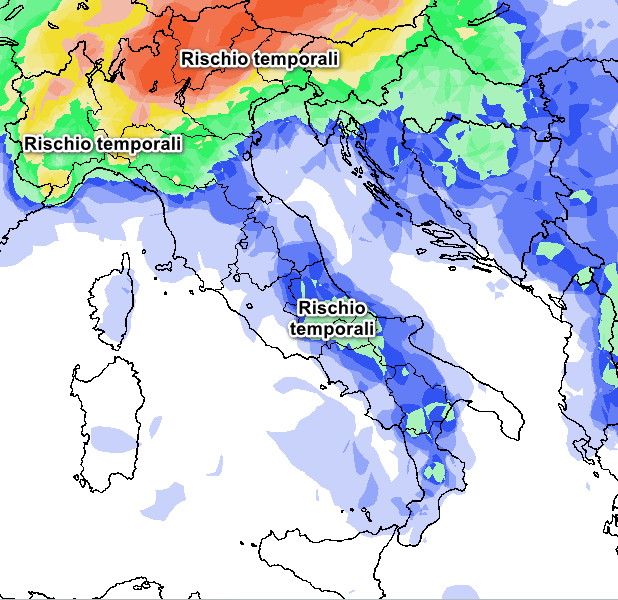- Blu: Probabilità di pioggia bassa (sotto al 25%)