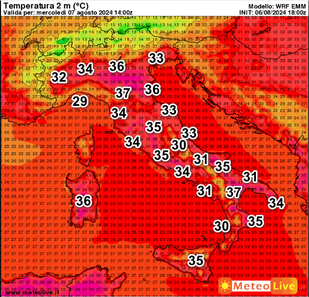 Punte di 37° sull’Emilia Romagna e sulla Lucania, 36° su diverse aree della Valpadana e in Sardegna…insomma, un’altra giornata molto calda da nord a sud.