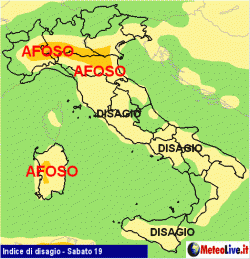 Il caldo risulterà afoso specie sulla Pianura Padana e nelle zone interne della Sardegna, ma un po’ su tutta la Penisola si avvertirà un certo disagio, stante la combinazione tra tasso di umidità e alte temperature (indice di calore).