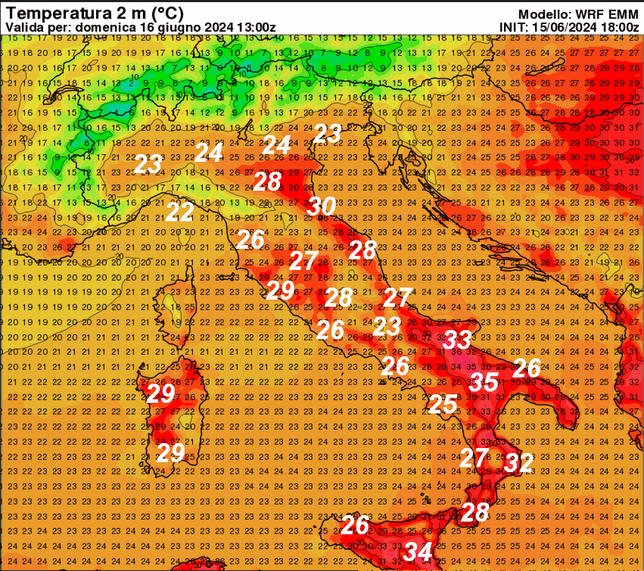 Sul fronte delle temperature, questi sono i valori attesi in Italia alle ore 15 del pomeriggio odierno: