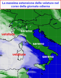 DOMANI: velature più dense nelle prime ore su isole, Mar Tirreno, regioni occidentali, quasi sereno sui versanti adriatici. Nel pomeriggio velature o altostrati limitati alle regioni più occidentali e segnatamente a Sardegna e Sicilia. Temperature in ulteriore aumento nei valori massimi.