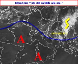 L’immagine satellitare di questa mattina è eloquente e mostra la spallata dell’anticiclone delle Azzorre ai danni della struttura instabile che ci ha interessato nei giorni scorsi. I temporali stanno fuggendo quasi intimoriti verso l’Europa orientale e sull’Italia sta salendo in cattedra il bel tempo.