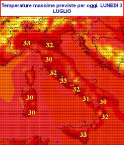 I valori più elevati e superiori a 30° si registreranno sulle pianure del nord, lungo il Tirreno, sulla Calabria Ionica, la bassa Lucania, la Sicilia orientale e la Sardegna interna.