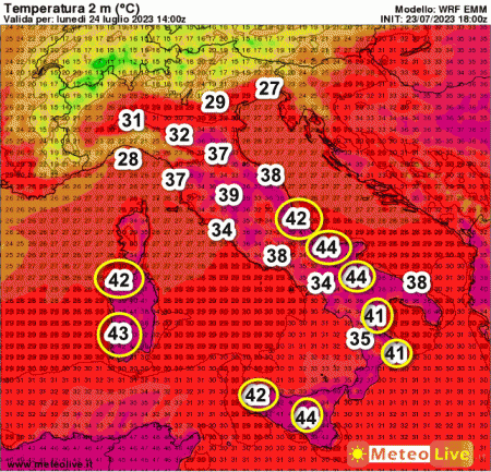 Abbiamo cerchiato in giallo i valori superiori a 40°. Punte di 44° saranno possibili sulla Puglia e la Sicilia, 43° nel sud della Sardegna, 42° sulle coste abruzzesi, molisane e in Calabria.