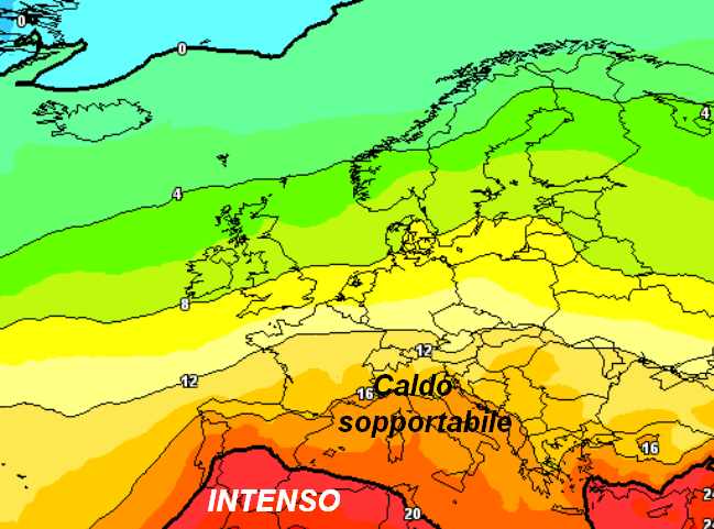 Un calo termico più consistente dovrebbe prendere piede attorno alla fine del mese. La seconda mappa, che illustra le temperature a 1500 metri attese in Europa per le ore centrali di lunedì 30 giugno, evidenzia come il caldo intenso dovrebbe ripiegare verso i suoi territori di origine.