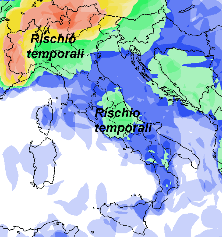 Infine, a fine mese aumenteranno anche i temporali. La terza mappa ci fornisce un’indicazione chiara della probabilità di pioggia e temporali per la giornata di lunedì 30 giugno. La probabilità è indicata con colori diversi: blu per bassa (sotto al 25%), verde per medio-bassa (tra 25 e 50%), giallo per medio-alta (tra 50 e 75%) e rosso per alta o molto alta (oltre il 75%).