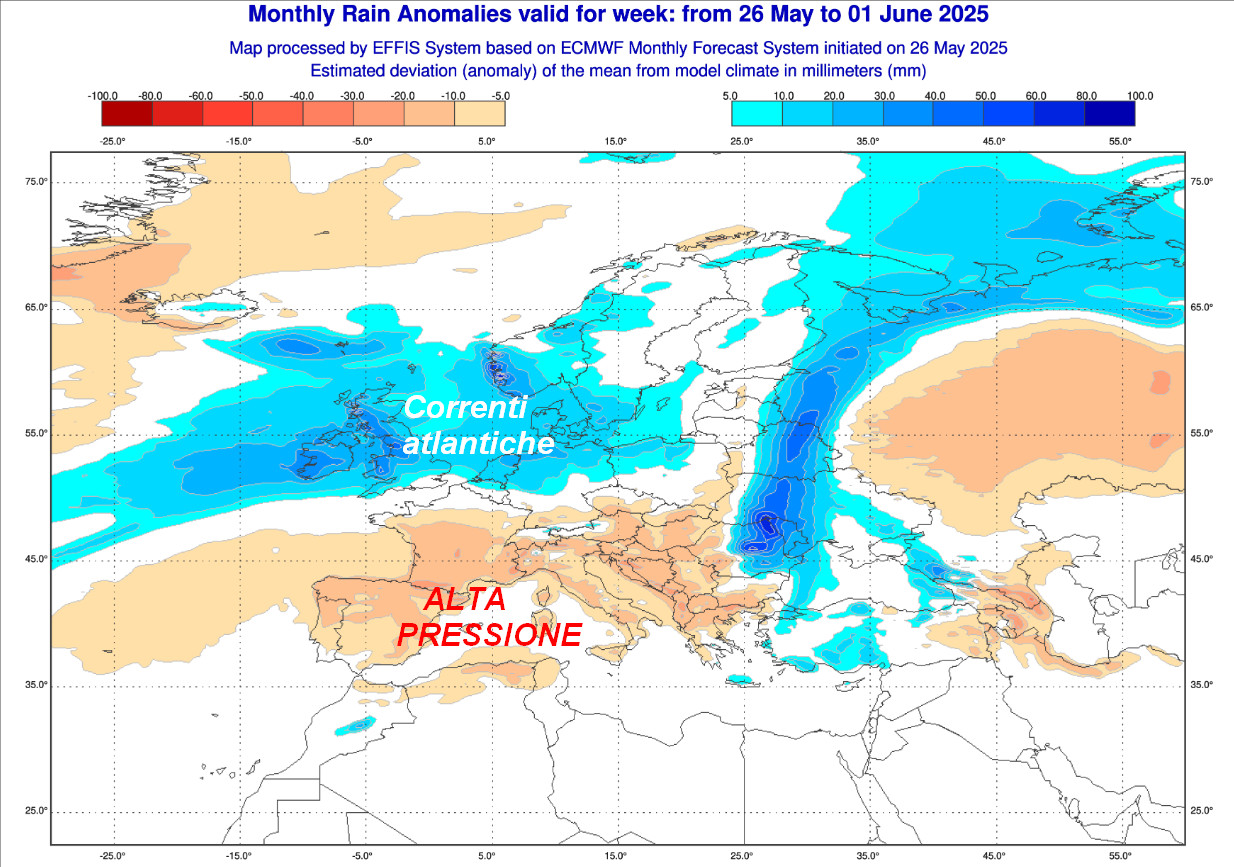 La seconda mappa mostra invece le ANOMALIE PRECIPITATIVE attese in Europa fino a domenica 1 giugno: