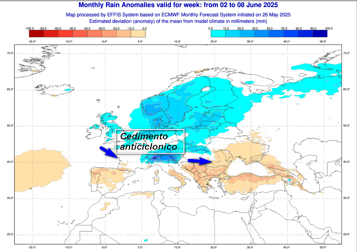 Infine, queste sono le ANOMALIE PRECIPITATIVE attese in Europa tra il 2 e l’8 giugno:
