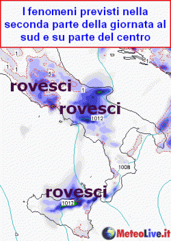 PROSSIME ORE: ancora rovesci sono attesi sulla Sicilia, la Campania, il basso Lazio, il Molise e in genere le zone interne ed appenniniche del centro-sud durante il pomeriggio. In particolare, con la rotazione del vento a NE sulle regioni centrali, alcuni focolai temporaleschi potrebbero muoversi nel pomeriggio dall’Appennino verso le zone pianeggianti del Lazio. Entro sera comunque si avrà un deciso miglioramento.